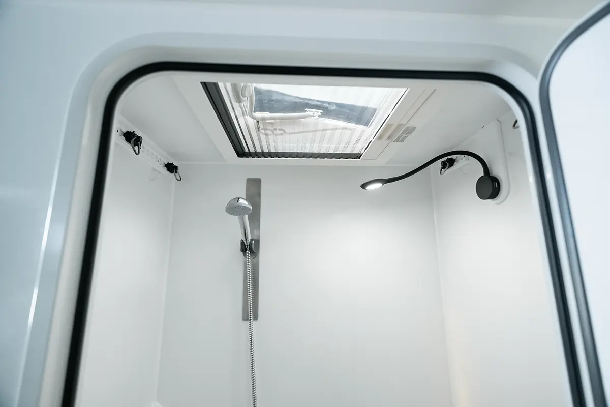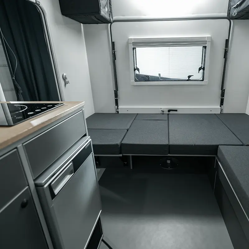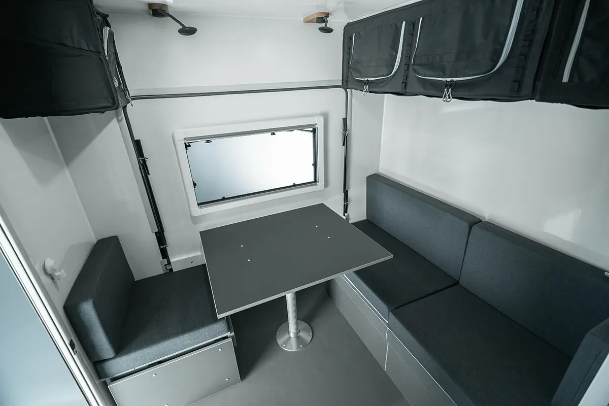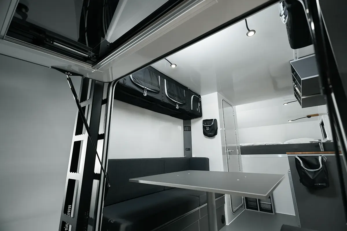 Ein besonderes Highlight der Kabine ist die große Heckklappe, die geöffnet einen sensationellen Panoramablick ins Freie bietet. Sie vermittelt dem Camper das einzigartige Gefühl, direkt unter dem freien Himmel zu sitzen.
